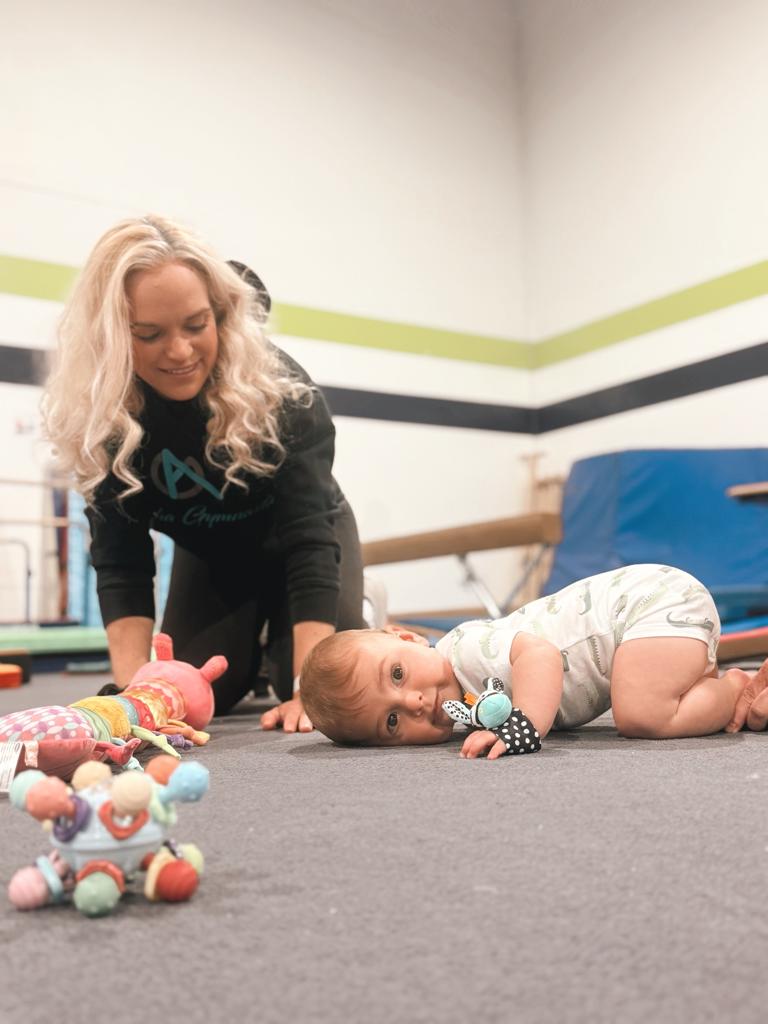 In Born to Move at Alpha Gymnastics, babies develop foundational movement patterns such as rolling, crawling, reaching, pulling, pushing, and stepping. These patterns support coordination, strength, and body control — and they form the base for later skills like running, jumping, and sports.